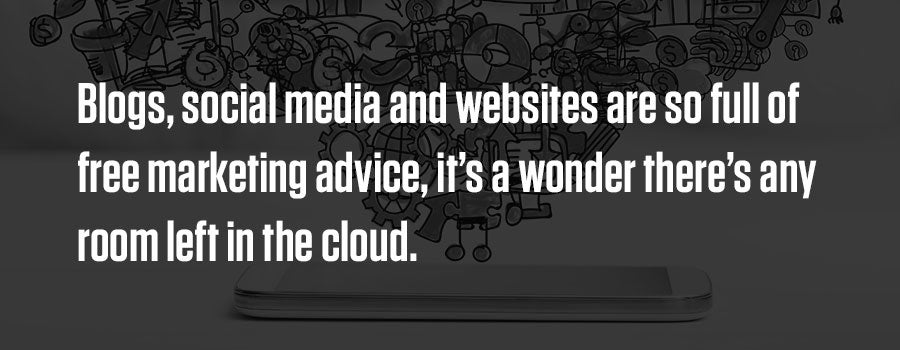 Blogs, social media and websites are so full of free marketing advice, it’s a wonder there’s any room left in the cloud. But if your company is attempting to use this free information to learn about marketing and decide whether to invest in a campaign, be careful. With free advice, you get what you pay for, and what you pay for is mostly confusion.