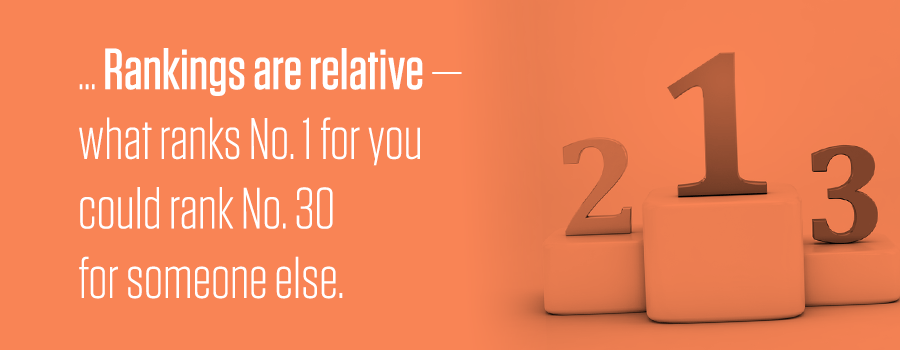 Rankings used to be THE way to assess SEO campaigns. No longer true! Because Google now personalizes SERPs (search engine results pages) according to the user’s geographic location, search history and other variables, rankings are relative — what ranks No. 1 for you could rank No. 30 for someone else.