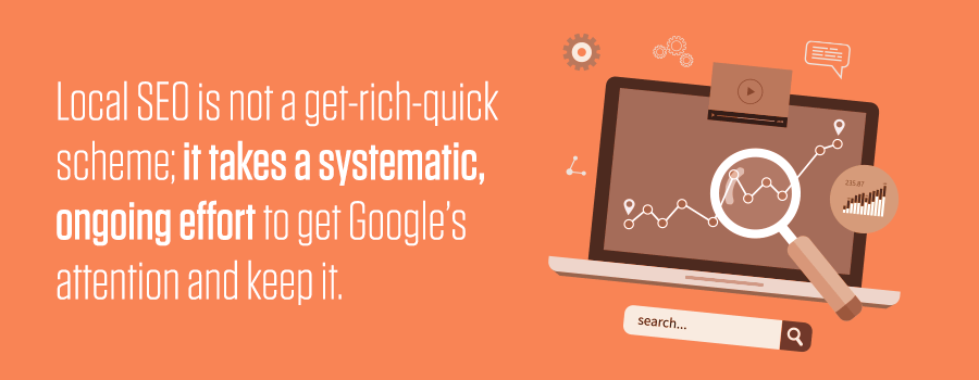 - The local SEO budget must be big enough to move the dial, yet small enough to be sustainable over at least one or two years. Local SEO is not a get-rich-quick scheme; it takes a systematic, ongoing effort to get Google’s attention and keep it.