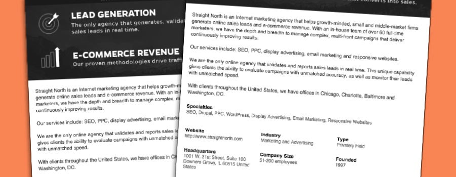 - Clean up and/or complete your social media pages to include company information optimized with strategic SEO keywords/hashtags. Since your social shares will attract new visitors to your social media properties, it’s important to put your best foot forward by displaying a persuasive company overview, along with high-quality, customized imagery. In addition, by using keywords/hashtags, it is easier for your target audience to find and connect with you on social media, further expanding reach and engagement. As an example, here is our LinkedIn profile:
