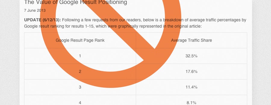 In the past, many companies have produced reports and studies to claim an average traffic share (or CTR) for each of Google’s top 10 positions. See here and here for examples. Whatever value this data once had, it has far less today, if any. Here’s why: