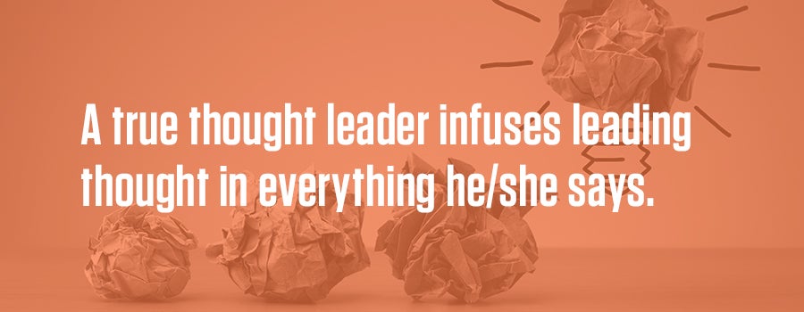 Thought leadership — being an original, innovative and influential thinker in your field — is something people recognize without being told or sold. A true thought leader infuses leading thought in everything he/she says. It’s not a marketing objective; it’s a part of who he, she or an organization is.