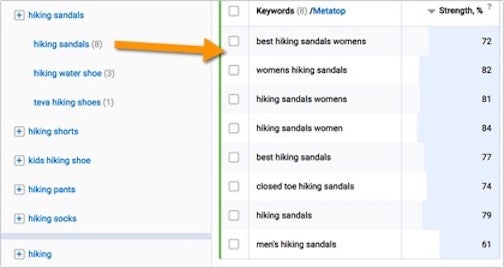 From there, you can quickly come up with the plan on how you are going to address each group. For example, “best hiking sandals womens” and “hiking sandals women” are basically the same phrase, so you simply make sure you mention different variations of the phrase within your content (when it makes sense, of course). However ...