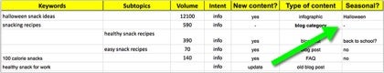 To makes things easier, I label those seasonal content ideas right within my keyword worksheet: