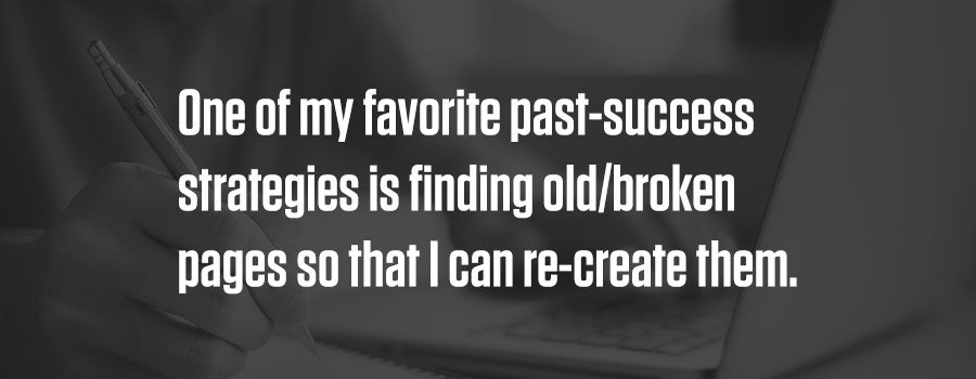 One of my favorite past-success strategies is finding old/broken pages so that I can re-create them. This ends up working really well because you are basing a new creation on a topic that already is a proven attention-getter with the linking public. We also can analyze the page’s backlink profile to see what types of sites link to it, and find more like it. Since similar sites have demonstrated a pattern of linking to similar posts, it bodes well for us to pitch to them. We also have all of the sites that link to the broken link as outreach targets.