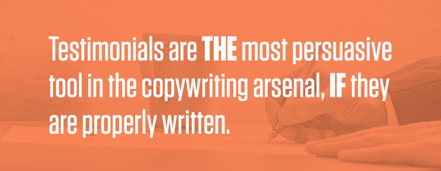 - Use testimonials. Testimonials are THE most persuasive tool in the copywriting arsenal, IF they are properly written. Testimonials overcome both indifference and skepticism, by revealing value to indifferent readers and establishing credibility with skeptical readers. Key specifics to creating a great testimonial: