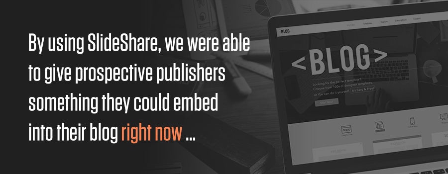 By using SlideShare, we were able to give prospective publishers something they could embed into their blog right now, to show off this information through an embed code that SlideShare generates. We would then offer to write an introduction paragraph so publishers did not have to invest much time or effort to post it on their sites.