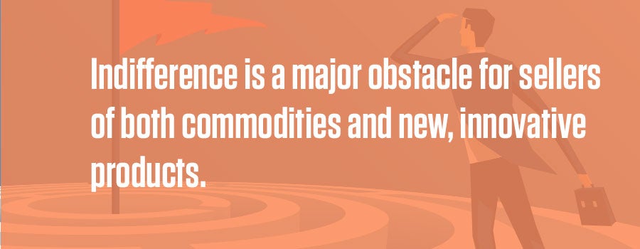 Indifference is a major obstacle for sellers of both commodities and new, innovative products. For commodities, buyers are indifferent because they already have 5, 10 or 100 suppliers lined up. For new products, buyers are indifferent because they do not recognize a need. Either way, sellers have to overcome indifference. These techniques may do the trick.