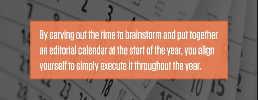 By carving out the time to brainstorm and put together an editorial calendar at the start of the year, you align yourself to simply execute it throughout the year. This helps you to know what your topic is ahead of time so you don’t have to go back to the drawing board at the start of every month, helps to schedule and coordinate all teams involved, and avoids the pitfall many fall into — sending an email whenever inspiration hits (which can be seldom)!