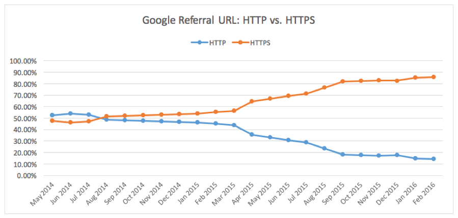 As of February 2016, we are seeing that only 14.34 percent of referral URLs includes HTTP and 85.66 percent includes HTTPS.