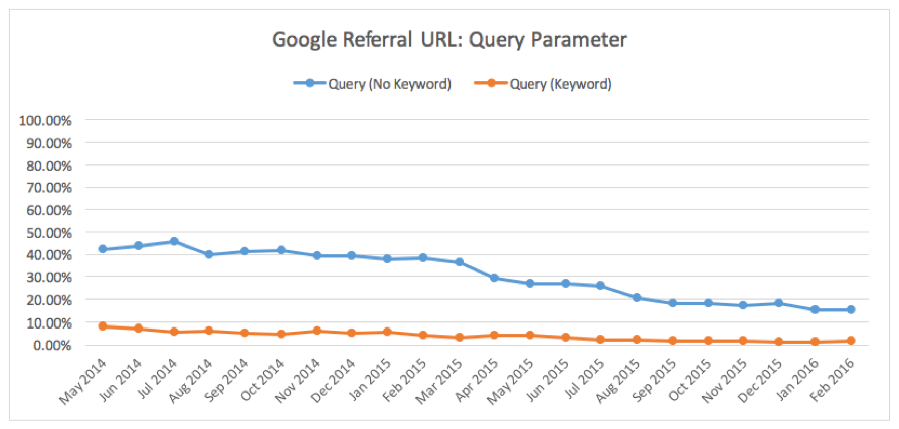 As of February 2016, we are seeing an empty value assigned to the query parameter in 15.26 percent of all referral URLs analyzed. We are also seeing that the query parameter still includes a keyword in 1.52 percent of referral URLs.