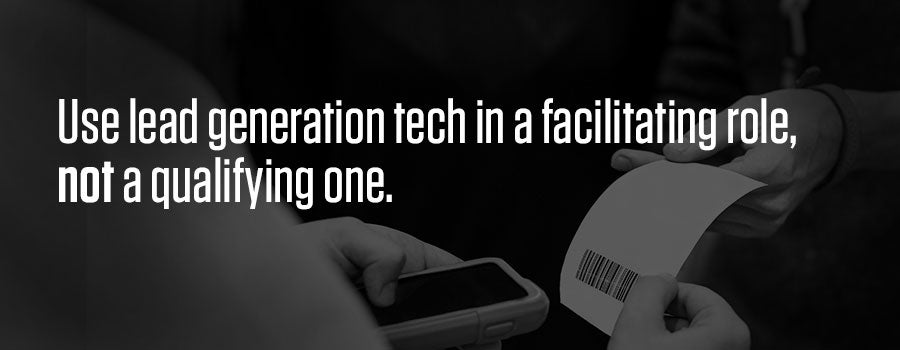 Use lead generation tech in a facilitating role, not a qualifying one. Select a lead generation technology provider that can offer you the type of information collection (or at least a viable workaround) that helps you reach your sales goals both at and after a trade show.