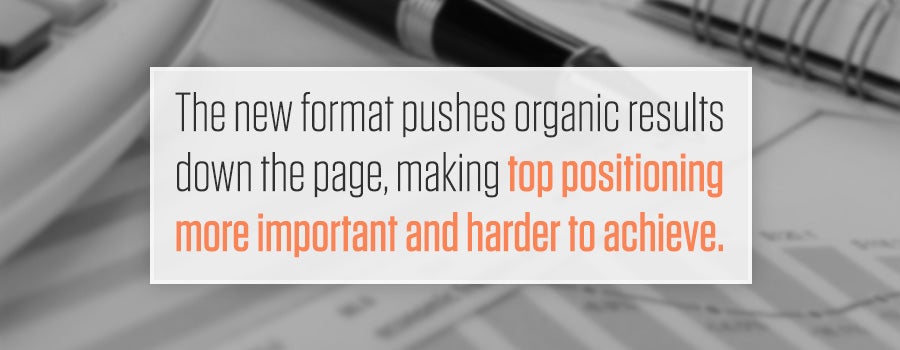 A more challenging issue is how the new ad format will affect SEO. The new format pushes organic results down the page, making top positioning more important and harder to achieve. This may lead companies to invest more heavily in SEO, and also develop a more refined strategy.