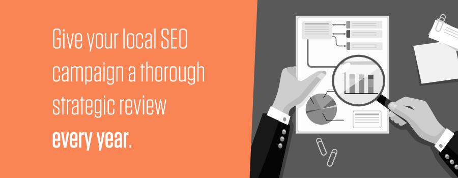 Google continues to get more sophisticated in its ability to identify high-quality local website content and give it high visibility for relevant organic searches. As Google’s technical ability evolves, certain local SEO tactics will become more important, other tactics will become less important, and entirely new tactics will appear. Bottom line: Give your local SEO campaign a thorough strategic review every year. Retain an SEO consultant such as Straight North to get a fresh perspective.