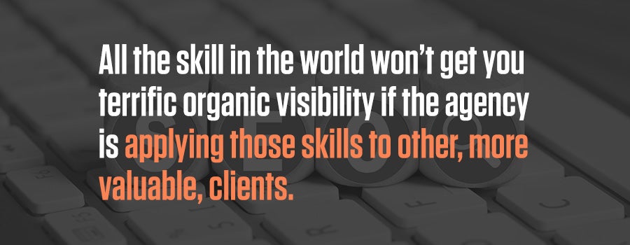 The second problem with a technical selection focus is this: Even if an SEO is technically proficient, does the SEO have the time and focus to produce results for you? All the skill in the world won’t get you terrific organic visibility if the agency is applying those skills to other, more valuable, clients.