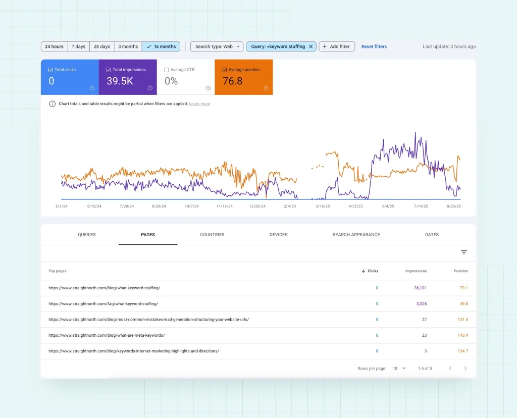 - Spot potential overlaps: Look for cases where multiple pages on your site may be targeting the same or very similar keywords. Then check whether this overlap is having a negative impact on rankings, traffic, or visibility.