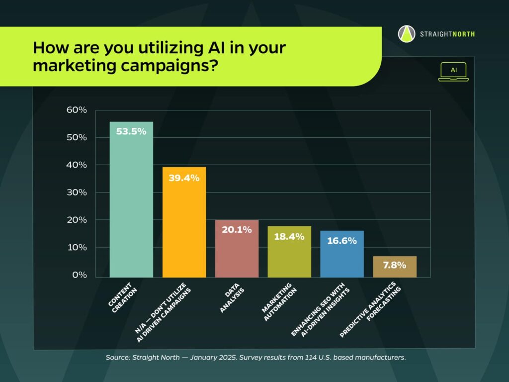 Given that manufacturers typically operate with leaner marketing departments, we aimed to understand how frequently and in what ways they are utilizing AI to support their efforts.