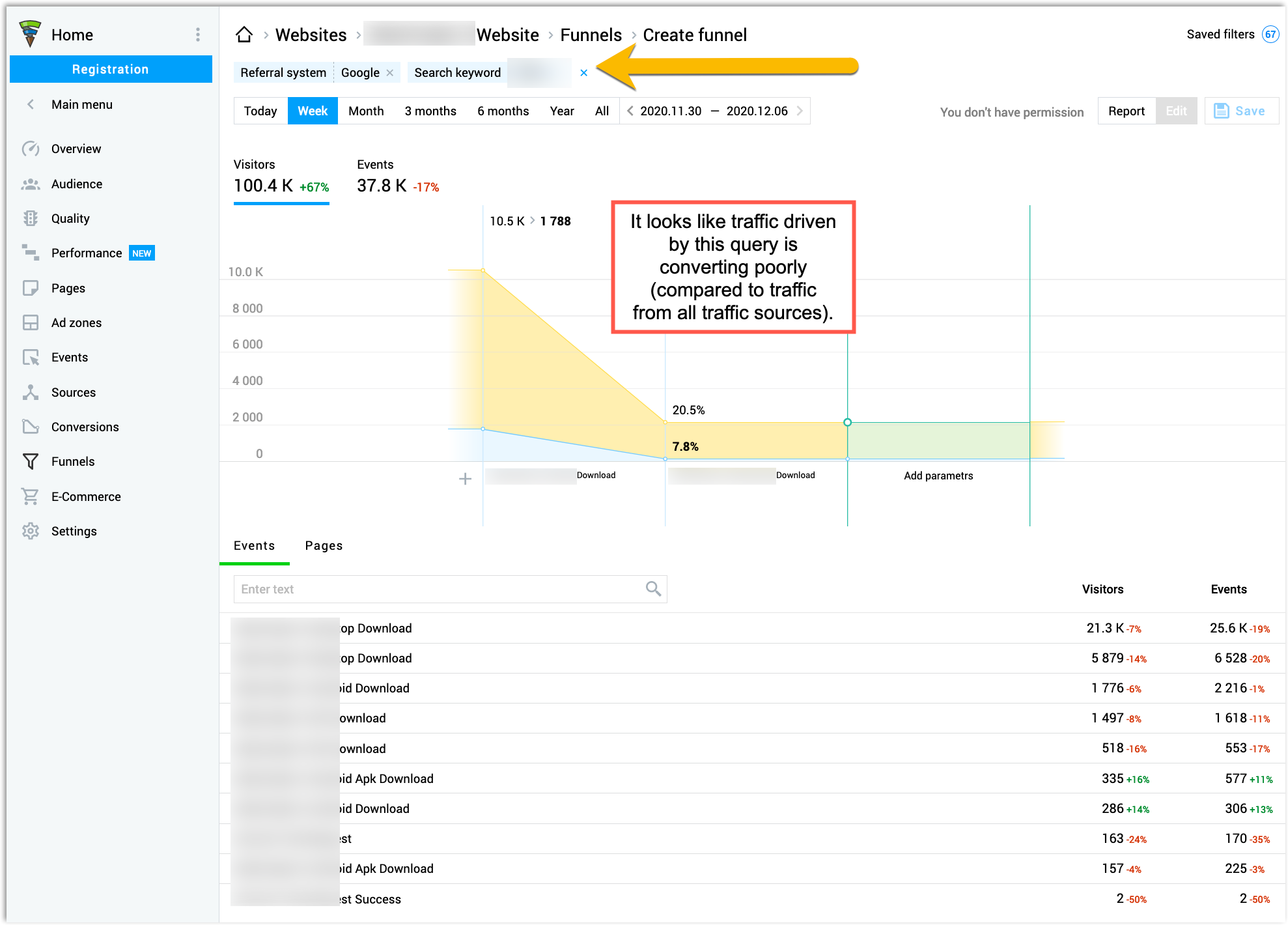 Simply install the script, and then click through to Google to filter all your further reports to Google’s organic traffic. So you can see how your organic traffic is following through your sales funnel, for example: