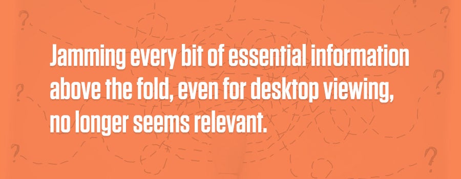 Desktop users, we should remember, also figure to be mobile users. As such, they are accustomed to scrolling. Even in desktop view, the idea of scrolling for more information has taken root; jamming every bit of essential information above the fold, even for desktop viewing, no longer seems relevant.