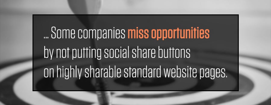 - Display social share buttons on sharable website pages. On the flip side of this issue, some companies miss opportunities by not putting social share buttons on highly sharable standard website pages. Great candidates: