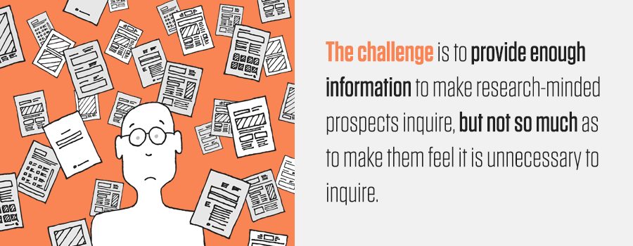 - Secondary Text. Some readers won’t be content to just scan; they will be interested in product/service details. Secondary text should provide them with an education, but balance this with a good lead generation funnel. Some clients err by giving too much information, trying to replace the sales department with a Web page. The challenge is to provide enough information to make research-minded prospects inquire, but not so much as to make them feel it is unnecessary to inquire.
