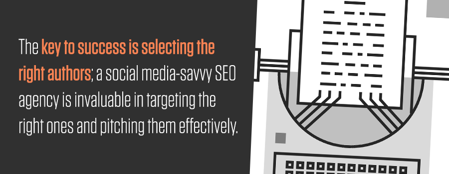 - Invite guest authors to contribute to your company blog(s). If authors are selected based on relevance, credibility, skill and their social media followings, their articles will attract a new relevant audience, strengthen your credibility, and create new sales leads and secondary conversions. In addition, guest articles will likely generate new connections to your social sites, expanding your reach for subsequent shares of other content and setting the stage for future website traffic and leads. The key to success is selecting the right authors; a social media-savvy SEO agency is invaluable in targeting the right ones and pitching them effectively.