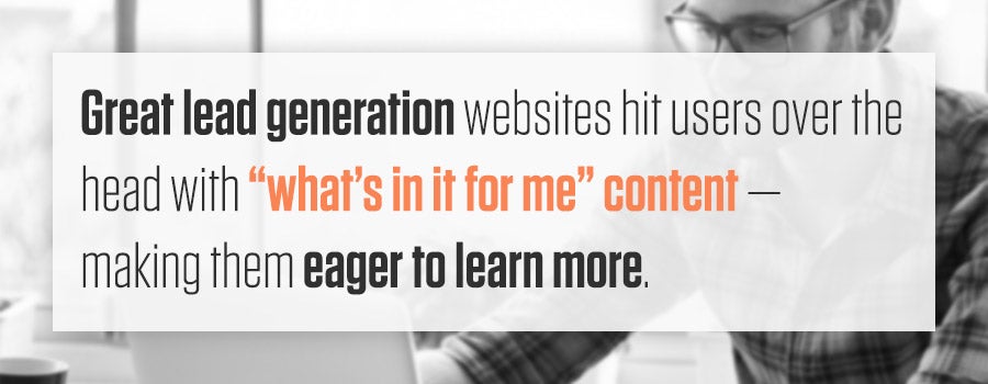 Users need a lot of motivation to phone in or submit a form. Usually, companies fail to appreciate this and write website content that is heavy on features, benefits and self-congratulatory statements rather than zero in on what problems they solve for customers. Great lead generation websites hit users over the head with “what’s in it for me” content — making them eager to learn more.