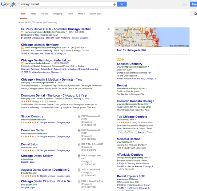 1. In this search for "chicago dentist", ads and local search results dominate the page: