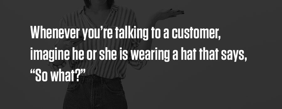One of my sales mentors used to say that whenever you’re talking to a customer, imagine he or she is wearing a hat that says, “So what?” Ever since I heard that, I keep it in mind whenever I’m writing or editing website content.