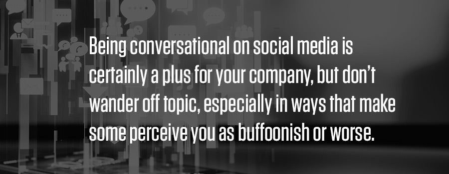 - Jokes about politics and social issues are bound to rub prospects the wrong way. This one should go without saying, but I’m saying it because so many companies ignore this basic business rule, particularly in social media marketing communication. Being conversational on social media is certainly a plus for your company, but don’t wander off topic, especially in ways that make some perceive you as buffoonish or worse.