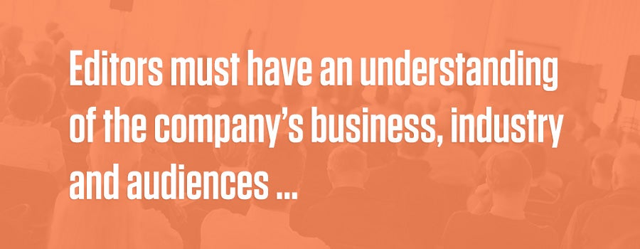 - Editors must have an understanding of the company’s business, industry and audiences (customers, prospects, employees, etc.). Without a feel for these things, the editor will be helpless to identify flaws in the content’s brand presentation; degree of complexity/simplicity; and descriptions of products, services and customer issues. True, internal/client reviewers can catch these mistakes, or many of them, but this slows down the process and excessively burdens people with many other priorities. Clients will also become irritated if they are continually seeing a need for extensive editing in content their agency is submitting — the problem here, of course, is that the agency may end up getting fired.