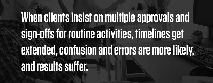 - Campaigns run most efficiently when day-to-day activities are as streamlined as possible. The best times to be hands-on are during campaign performance reviews. When clients insist on multiple approvals and sign-offs for routine activities, timelines get extended, confusion and errors are more likely, and results suffer.