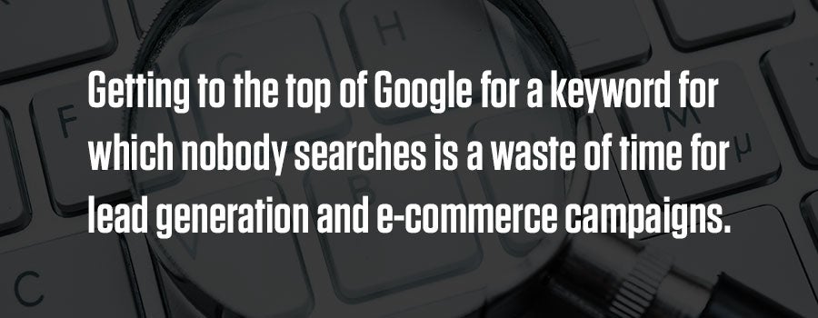 We see this frequently when conducting SEO audits. If keywords have been selected without careful research, you may be chasing keywords that sounded good to you in theory but have limited or no search volume. Getting to the top of Google for a keyword for which nobody searches is a waste of time for lead generation and e-commerce campaigns.