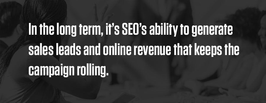 In the long term, it’s SEO’s ability to generate sales leads and online revenue that keeps the campaign rolling. After a reasonable amount of time has elapsed (1-2 years on average), some companies choose to move toward other marketing options because they’re not seeing a critical mass of leads or direct online revenue.