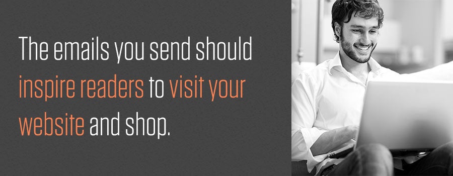 Remember, the emails you send should inspire readers to visit your website and shop. Emails also should be the one-click gateway to get those in your database to browse and buy your products.