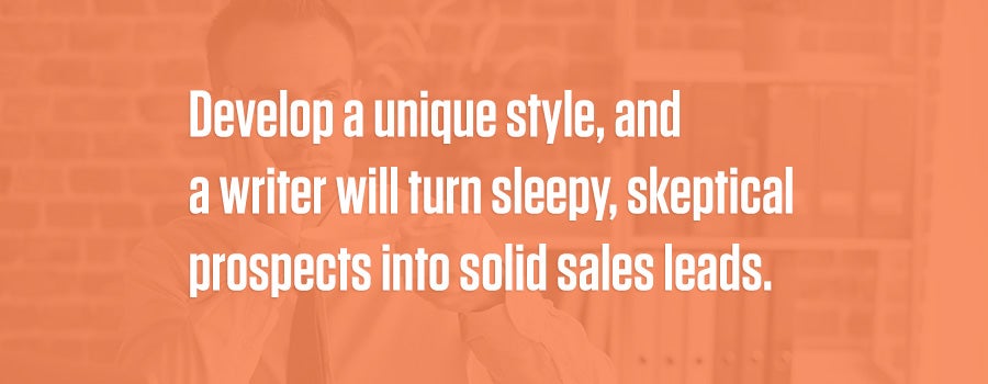 Almost all business writing suffers from one glaring problem: lead-killing blandness. Whether the company’s objective is to educate or persuade prospects, boring content can only put prospects to sleep or drive them away. Develop a unique style, and a writer will turn sleepy, skeptical prospects into solid sales leads.