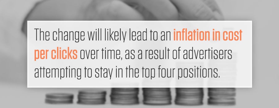 One budget implication: The change will likely lead to an inflation in cost per clicks over time, as a result of advertisers attempting to stay in the top four positions.
