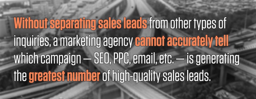 Without separating sales leads from other types of inquiries, a marketing agency cannot accurately tell which campaign — SEO, PPC, email, etc. — is generating the greatest number of high-quality sales leads, and therefore cannot accurately determine which campaigns to ramp up, ramp down or discontinue.