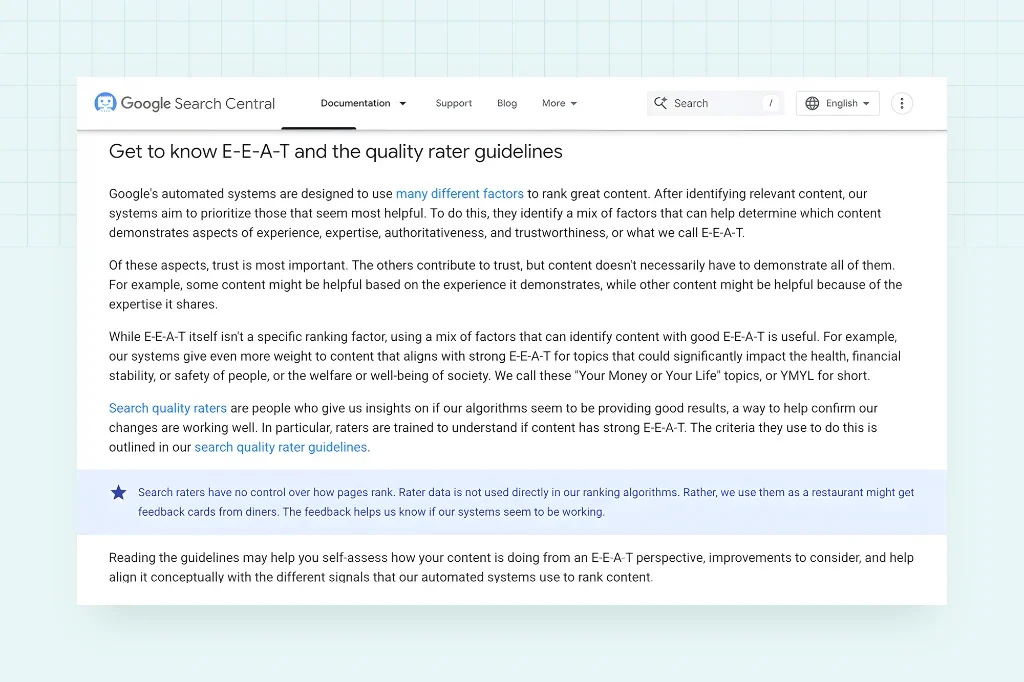 Important things to remember: E-E-A-T is especially crucial for “Your Money or Your Life” (YMYL) content in sensitive fields like finance and health, where credibility is paramount. While E-E-A-T isn’t a measurable score, it remains central to Google’s commitment to surfacing reliable, user-first content.