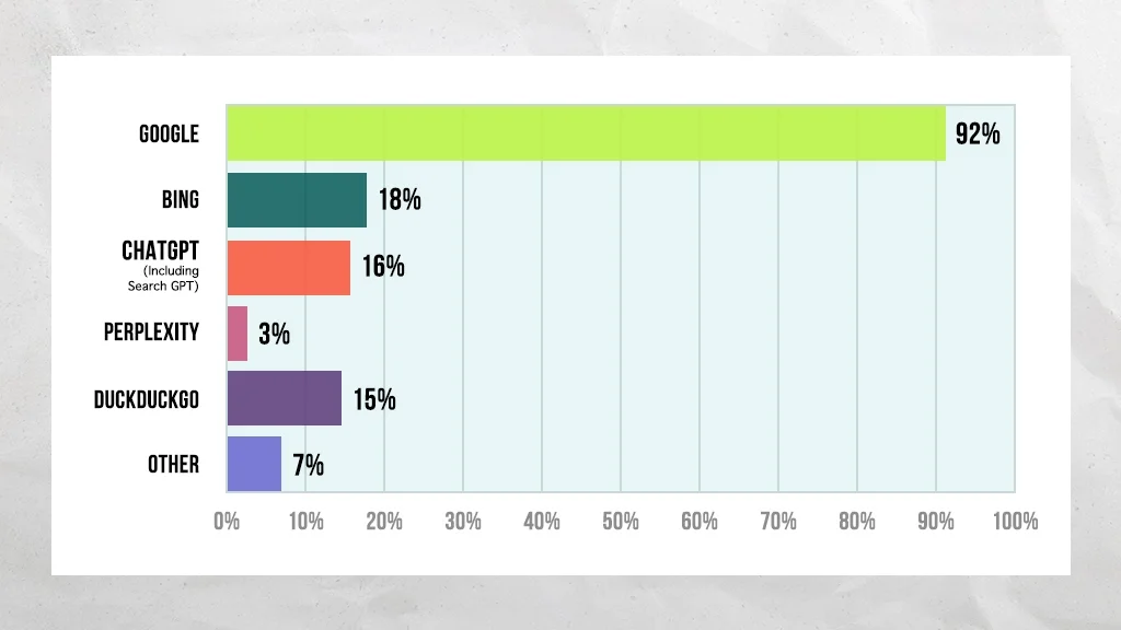Overall, the results weren’t too surprising. Google remains the dominant player, and DuckDuckGo may have more market share than typically reported. AI-powered platforms are gaining traction, but they’re not as widely used as I expected.