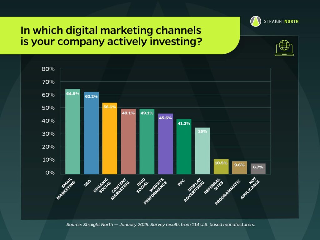 Regarding the data: Email Marketing leads the way, with 65% of respondents investing in that channel. SEO comes in second, with 62% of manufacturers allocating resources to it.