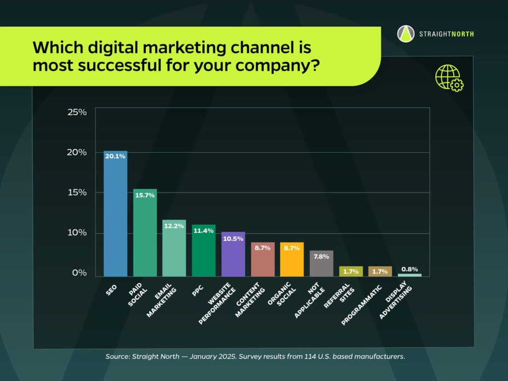 The leader is SEO, with 20% of manufacturers reporting it as their most successful digital marketing channel. Paid Social comes in second at 16%, followed by Email at 12%, and PPC at 11%.