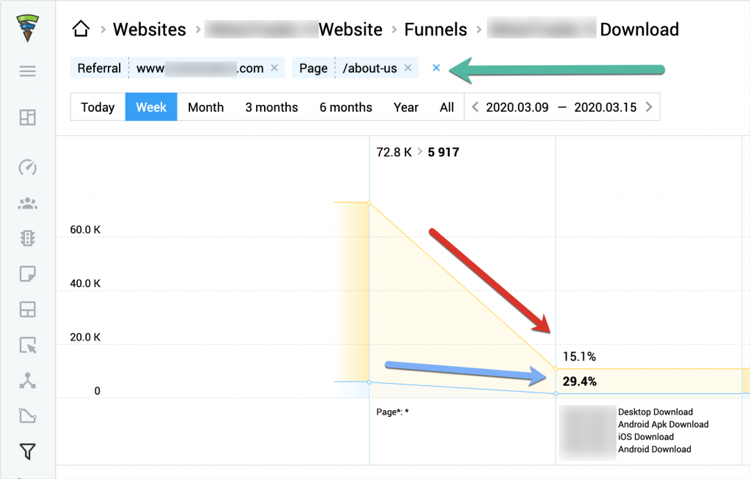 Finteza allows users to add events to track using their WordPress plug-in. Once you add events, you can log in to monitor your site users closely and compare your sales funnel performance based on an entry page, mobile device, traffic source, etc.