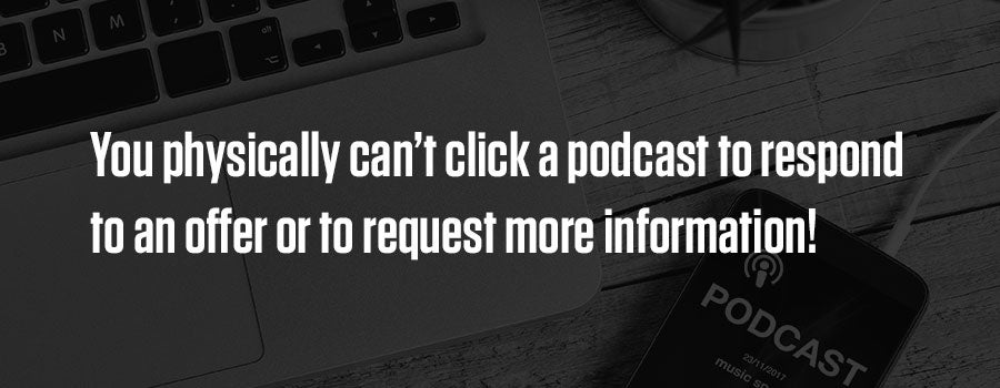 While the hosting service used for the podcast can provide a wealth of listening analytics, the one thing it usually can’t deliver is data on clicks to your website. You physically can’t click a podcast to respond to an offer or to request more information! Sure, special links (e.g., landing pages) can be announced in the show to help monitor podcast responses. But you have to remember that many people will be listening to the show in their cars while driving, making even that action less likely.