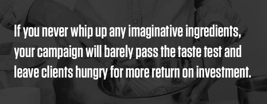 Brussels sprouts taste pretty bland until you baste them with a bit of buttery bacon sauce. Same goes for SEO. If you never whip up any imaginative ingredients, your campaign will barely pass the taste test and leave clients hungry for more return on investment.