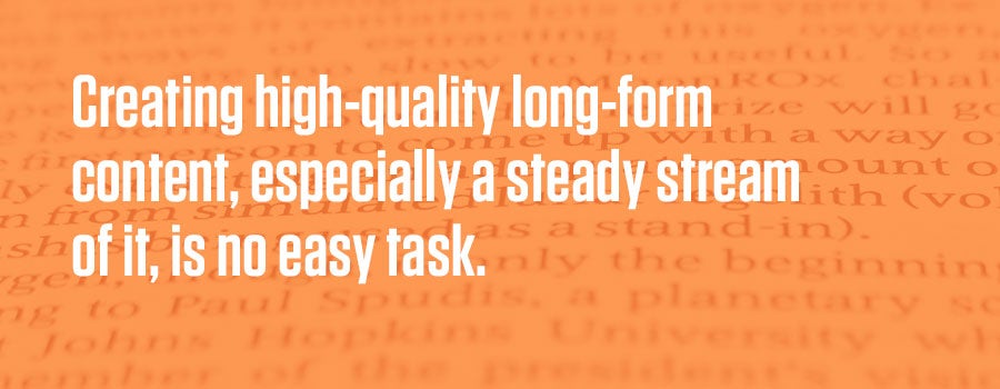 The problem comes with “well executed” and “good.” Creating high-quality long-form content, especially a steady stream of it, is no easy task. It requires research, interpretation of data, perhaps a week’s worth of time from a highly talented (and probably highly compensated) copywriter, extensive editing, extensive client/internal review, more editing, and considerable time from the design team to create supporting graphical elements.